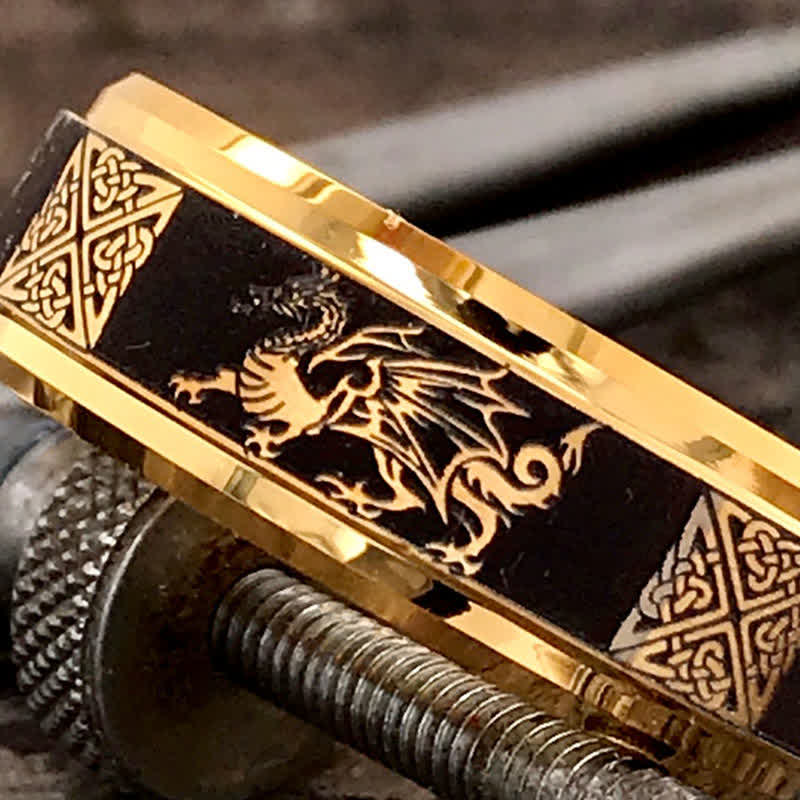 Crafted from robust tungsten carbide, renowned for its unmatched durability and resistance to scratching, the ring promises a lifetime of wear and enduring elegance. At its core lies an intricate Celtic dragon design, meticulously inlaid to capture the mythical creature’s fierce guardianship and endless wisdom. The detailed craftsmanship of the dragon intertwined with Celtic knots symbolizes a timeless connection to heritage and tradition.