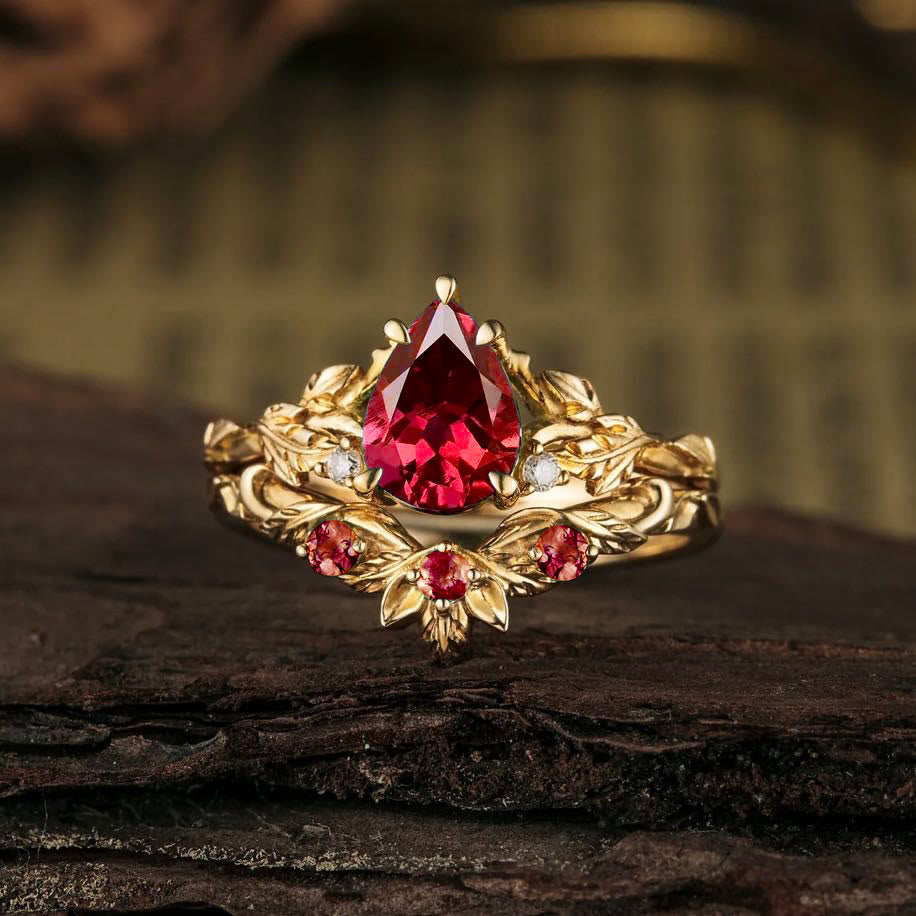 • Step into an enchanted forest with the Nature's Embrace Green Emerald Leaf Ring Set 🌿💚 A radiant pear-cut emerald sits nestled among golden vines and sparkling diamonds, echoing the beauty of nature and timeless love.