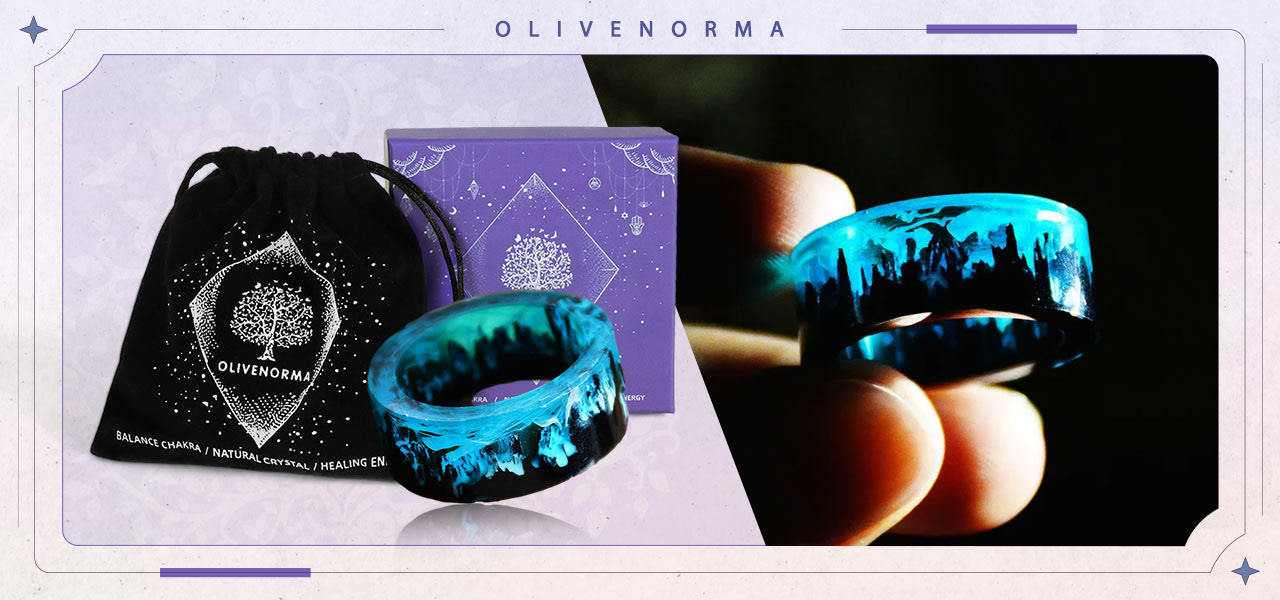 - This ring is made of blue resin, and white snow that glows in the darkness. Looking inside you can see the snow-covered ranges of the Arctic, cold and vast distances.