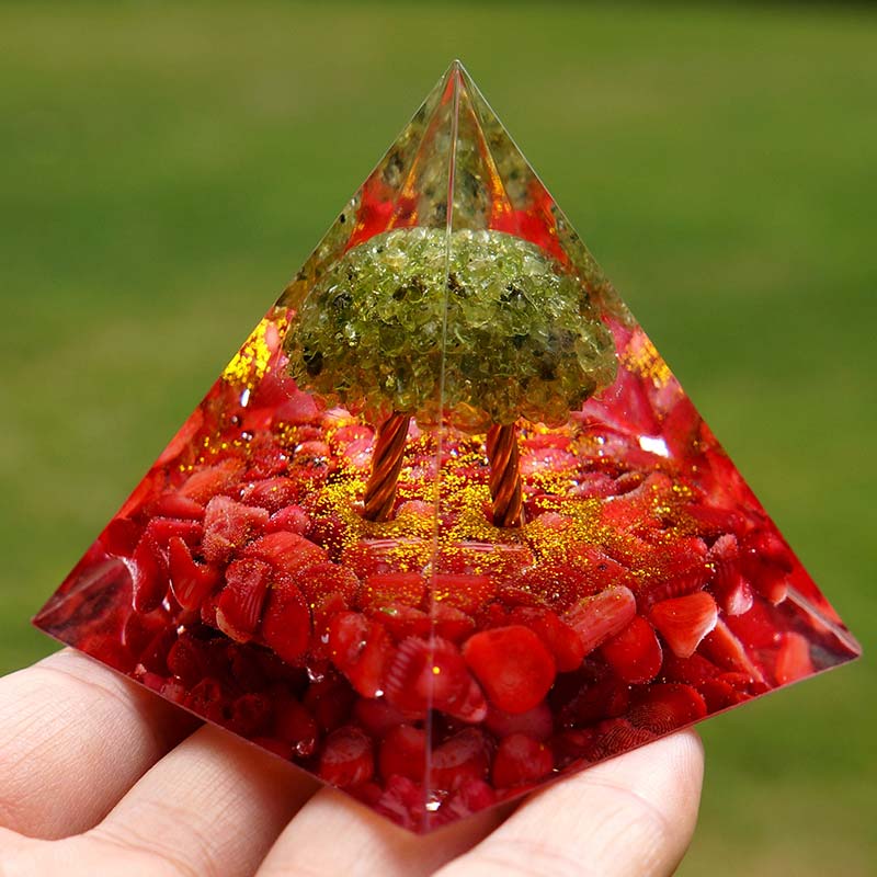 Olivenorma Peridot With Red Coral Tree Of Life Orgone Pyramid