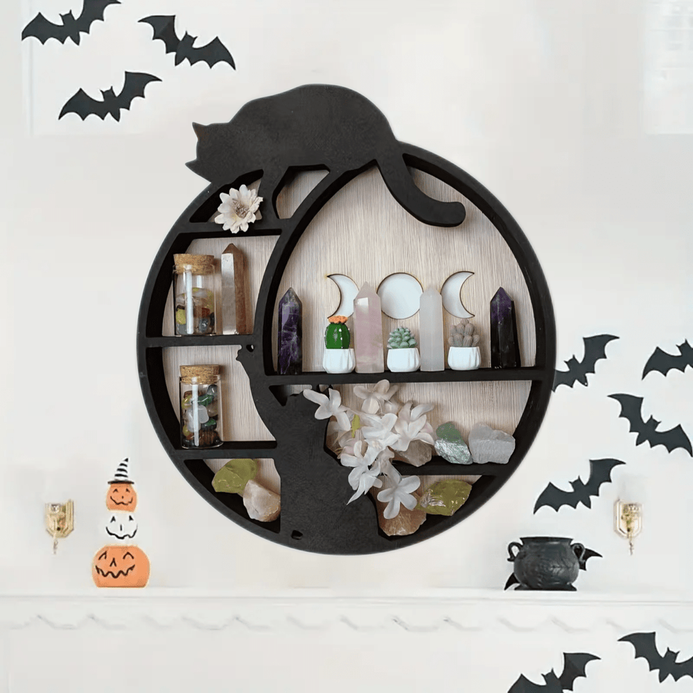 Olivenorma Boho Cat on the Moon Wooden Crystal Shelf